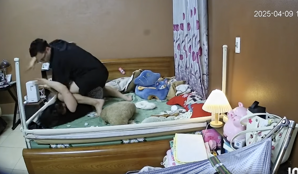 Bị chồng hành hung, người phụ nữ đã cố gắng phản kháng, cố gắng dùng chân và tay để ngăn cản trận bạo hành của chồng. Thế nhưng, gã chồng vẫn tiếp tục lao đến, ghì người vợ mới sinh con được 5 tháng xuống giường để hành hung.