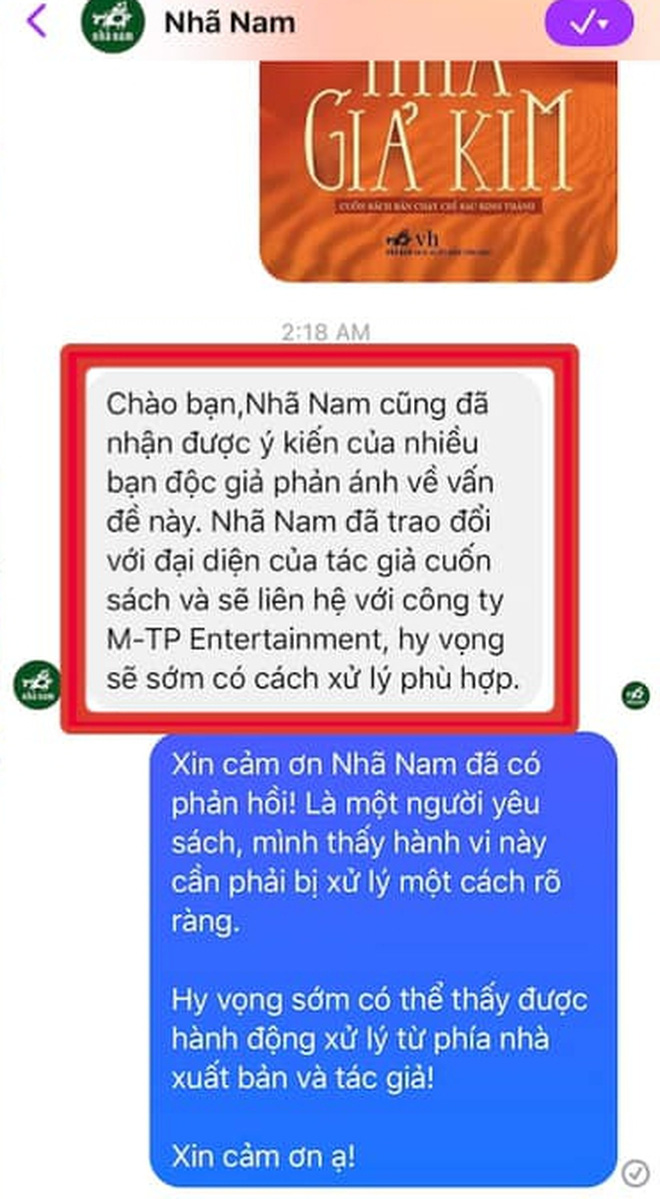 Không dừng lại ở việc nhắn tin cho Nhã Nam, một số bạn còn liên tục comment bày tỏ sự phẫn nộ trên trang Facebook tác giả Paulo Coelho, do đó đại diện của tác giả đã gửi mail cho Nhã Nam, mong muốn tìm hiểu rõ hơn về sự việc. Nhã Nam đã gửi thư chính thức theo đường chuyển phát nhanh đến công ty M-TP Entertaiment để chuyển lời tác giả, với mong muốn nhận được thông tin cụ thể hơn.