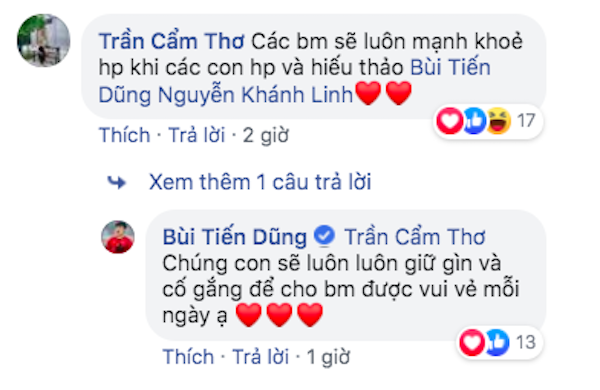 Nhận được sự quan tâm ngọt ngào như thế này từ trung vệ thì làm gì có ai không ‘tan chảy' cho được. Tài khoản facebook Trần Cẩm Thơ (mẹ vợ của cầu thủ) bình luận dưới bài đăng: ‘Các bố mẹ sẽ luôn mạnh khoẻ và hạnh phúc khi các con hạnh phúc và hiếu thảo!'.