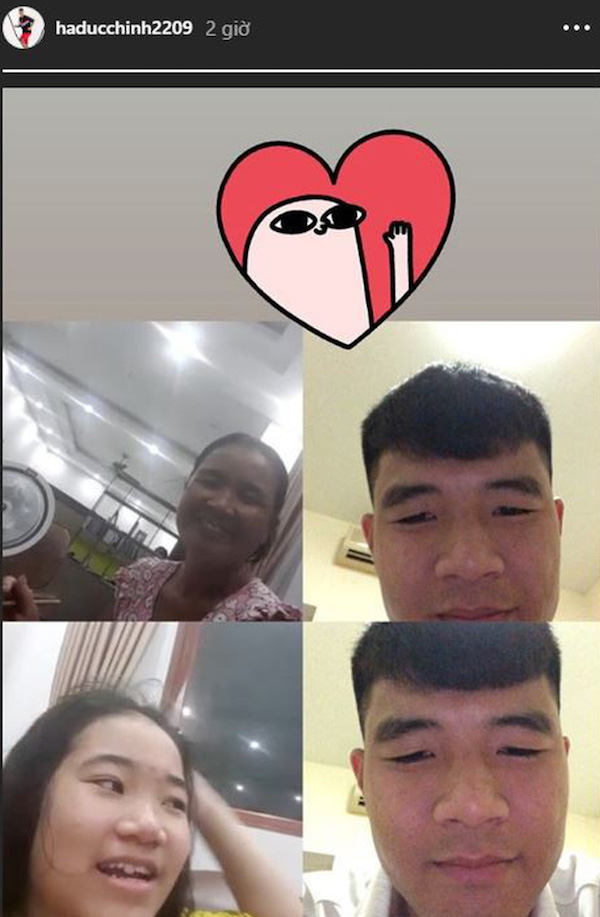 Tối 13/8, trên mạng xã hội, Đức Chinh chia sẻ bức ảnh chụp màn hình khi anh gọi video về cho mẹ và em gái. Anh chàng còn gắn thêm hình trái tim để biểu thị tình cảm dành cho hai người phụ nữ mà anh yêu thương nhất.