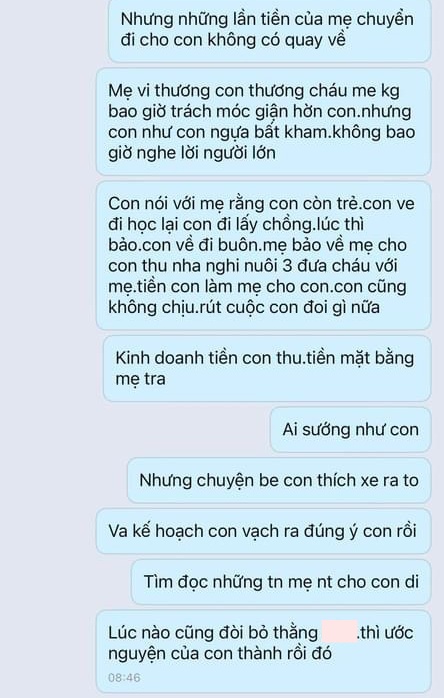 Cô thẳng thắn tuyên bố chuyện của người thứ 3 là người thứ 3, không liên quan đến tiền nong giữa mình và nhà chồng nên đề nghị mẹ chồng đừng đưa vào. “Đừng chạm tới giới hạn của tui. Sinh 3 đứa con đến giờ tui chưa chìa tay xin tiền mua sữa từ chồng hay mẹ chồng đâu” - nàng dâu này nói.