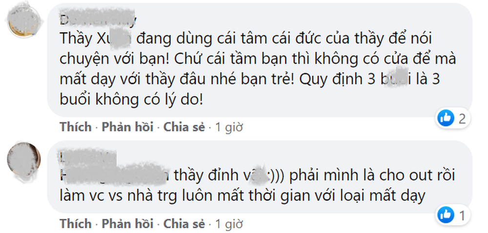 "Thầy X đang dùng cái tâm cái đức của thầy để nói chuyện với bạn, chứ cái tầm bạn không có cửa để mà mất dạy với thầy đâu nhé bạn trẻ, quy định 3 buổi là 3 buổi không có lý do", một số bình luận liên quan đến vụ việc của sinh viên.
