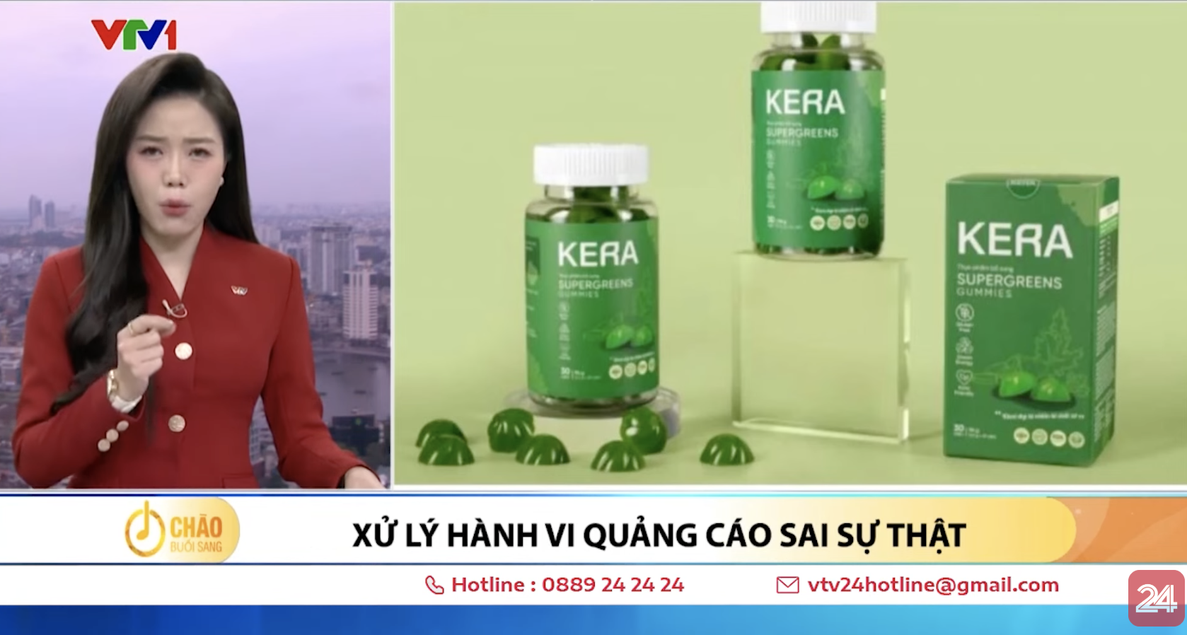 Nội dung của bản tin đề cập đến việc một người tiêu dùng đã mang đi kiểm định hàm lượng chất xơ trong viên kẹo rau củ, khác xa so với câu quảng cáo “1 viên tương đương với 1 đĩa rau”. Bên cạnh đó, bản tin cũng thông tin về việc các cơ quan chức năng đã vào cuộc và những người nổi tiếng tham gia quảng cáo đã chính thức lên tiếng xin lỗi người tiêu dùng.