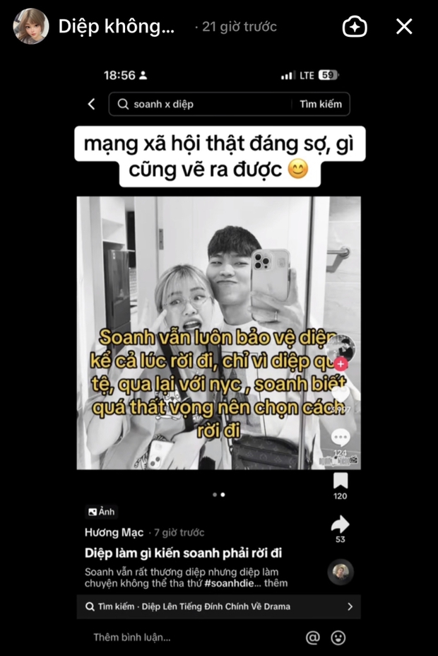 Trước đó, khi phát hiện nhiều bằng chứng cặp đôi hot TikToker đã rạn nứt như: Soanh unfollow Diệp trên TikTok; ảnh đại diện trên trang cá nhân được thay đổi thành màu đen, cụm từ tìm kiếm "Diệp không chổi ngoại tình" liên tục xuất hiện trên thanh tìm kiếm, các dòng mô tả tiểu sử như đang thông báo kết thúc chuyện tình... cư dân mạng đã đưa ra kết luận rằng cặp đôi đã chia tay.
