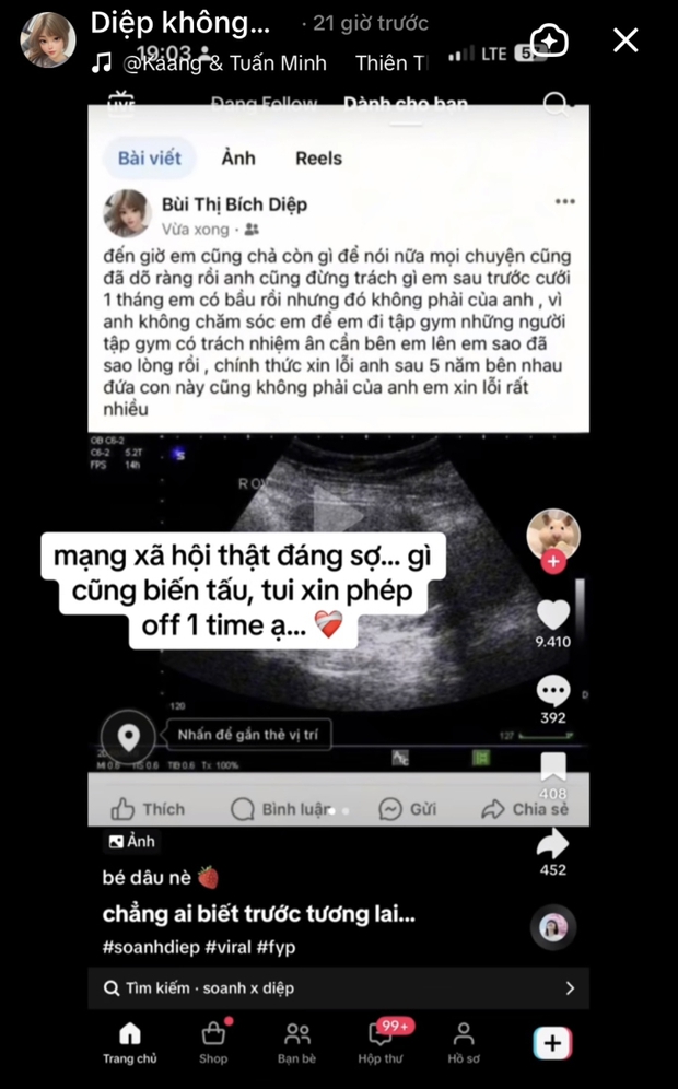 Nhân lúc drama đang được netizen quan tâm đỉnh điểm, rất nhiều tài khoản giả mạo nữ TikToker được lập ra, một phần để lan truyền các tin đồn, một phần tranh thủ kiếm follower. Đứng giữa tâm bão, cô nàng chia sẻ: "Diệp chỉ có duy nhất tài khoản tick xanh này. Trong thời gian tui off mạng xã hội, mong những người yêu thương tui không bị ảnh hưởng bởi những thông tin sai lệch. Diệp cảm ơn".