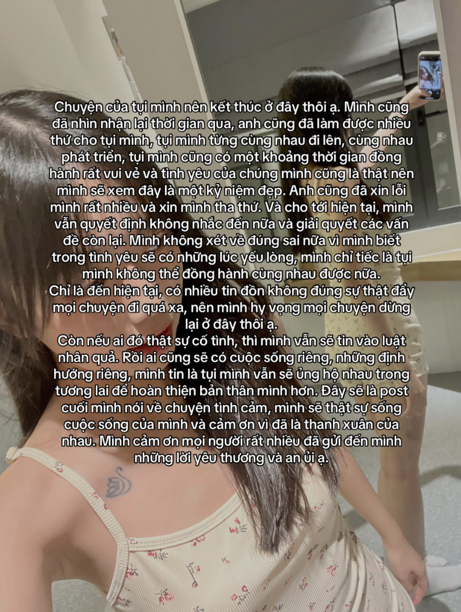 "Mình xin lỗi mọi người vì mọi lỗi lầm mà mình đã gây ra. Để mặc cho tình cảm làm mờ mắt. Mình xin lỗi mọi người xung quanh vì đã làm ảnh hưởng đến mọi người. Em nợ mọi người.