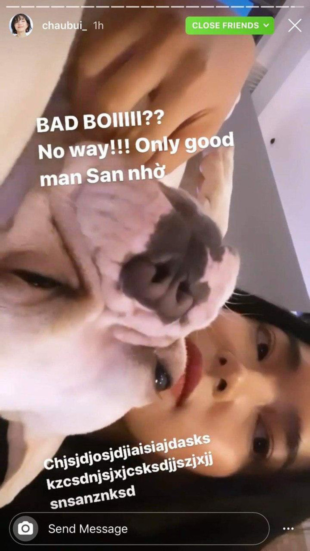Về phần Châu Bùi thì xin thưa rằng cũng không kém đâu khi mới đây, người ta đã phát hiện ra một chiếc story tưởng không liên quan mà lại liên quan không tưởng của cô nàng. Đang yên đang lành thì Châu Bùi lại đăng ảnh cùng chú cún cưng của mình. Nhưng quan trọng nhất là dòng caption trên ảnh cơ.