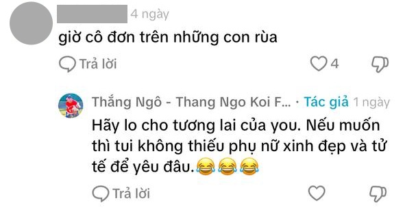 Cũng ở phía dưới clip này, Thắng Ngô không ngại nhắc đến chuyện lấy vợ mới đồng thời khẳng định xung quanh mình không thiếu phụ nữ trẻ đẹp để yêu. Cụ thể, khi có người nói nam doanh nhân này bây giờ ở cảnh cô đơn bên những chú rùa, Thắng Ngô đáp trả: “Hãy lo cho tương lai của bạn. Nếu muốn thì tui không thiếu những phụ nữ xinh đẹp và tử tế để yêu đâu”.
