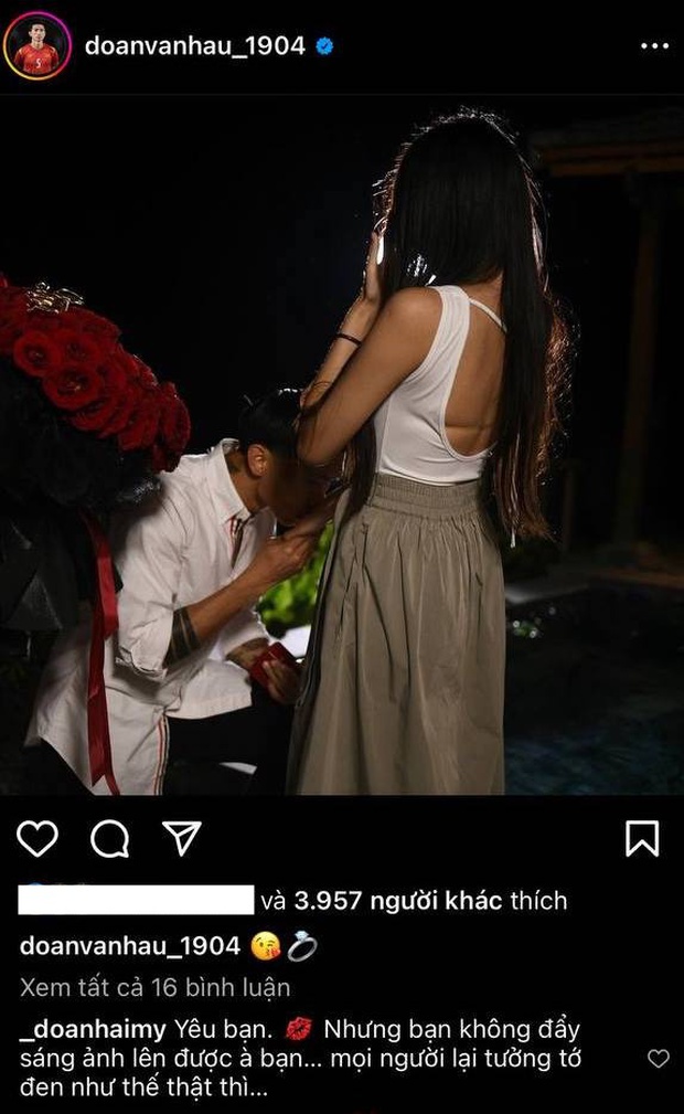 Do vậy, netizen cho hay chỉ cần nhìn vào cách trò chuyện cũng biết ai là “nóc nhà” khi cả hai chuẩn bị về chung nhà. Theo đó khi đăng tải khoảnh khắc xúc động trong buổi lễ cầu hôn, Đoàn Văn Hậu không chỉnh sáng hình khiến vợ sắp cưới càu nhàu: “Yêu bạn… Nhưng bạn không đẩy sáng lên được hả bạn? Mọi người lại tưởng tớ đen thật thế thì…” .