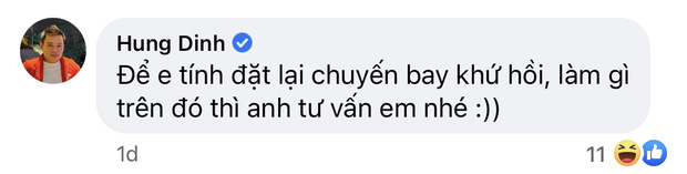 Đọc cũng biết đây chỉ là một lời nói đùa nên dân mạng không nhịn được mà bật cười. Đáng chú ý là phản hồi sau đó của CEO Hùng Đinh cũng láu lỉnh và hài hước không kém. Được bạn khuyên răn, CEO Hùng Đinh thật thà: "Để em tính đặt lại chuyến bay khứ hồi, làm gì trên đó thì anh tư vấn em nhé".