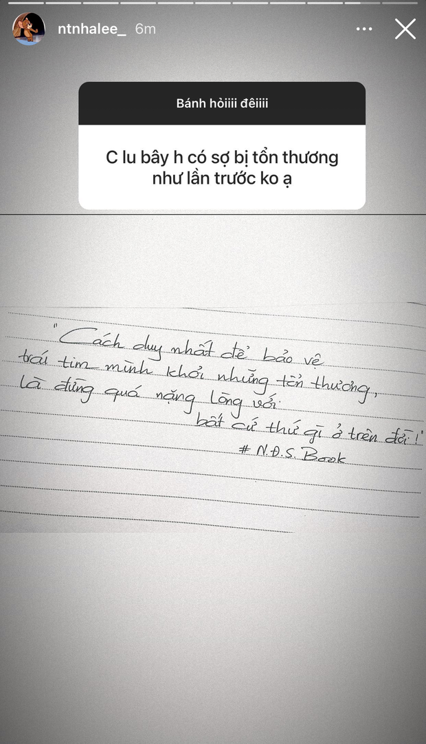 Giống như mới đây, một fan đã đặt câu hỏi về chuyện tình cũ - tình mới gửi đến Nhật Lê trên Instagram. Cụ thể, người này hỏi: "Bây giờ chị Lu (biệt danh của Nhật Lê) có sợ bị tổn thương như lần trước không ạ?".