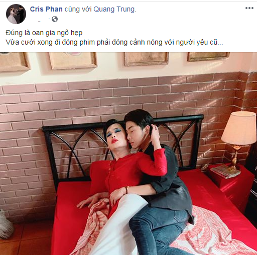 Trên trang cá nhân của mình, hot Youtuber công khai ảnh "giường chiếu" với Quang Trung và buông lời than thở: "Đúng là oan gia ngõ hẹp. Vừa cưới xong đi đóng phim phải đóng cảnh nóng với người yêu cũ..."