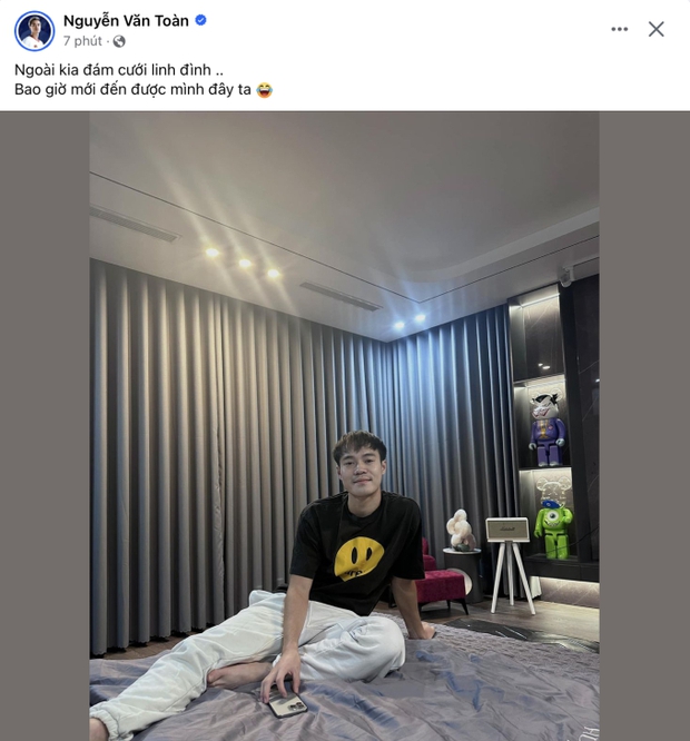 Thấy các đồng đội ai nấy cũng đã lập gia đình, có người đã sinh con tíu tít nên tiền đạo Nguyễn Văn Toàn cũng có phần sốt ruột, anh thường xuyên "rắc thính", "than ế" trên mạng xã hội. Mới đây tiền đạo sinh năm 1996 vừa đi dự đám cưới của đàn em Văn Hậu và Doãn Hải My đã vội "quăng thính" lên mạng:
