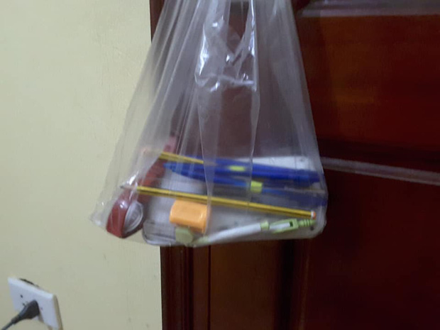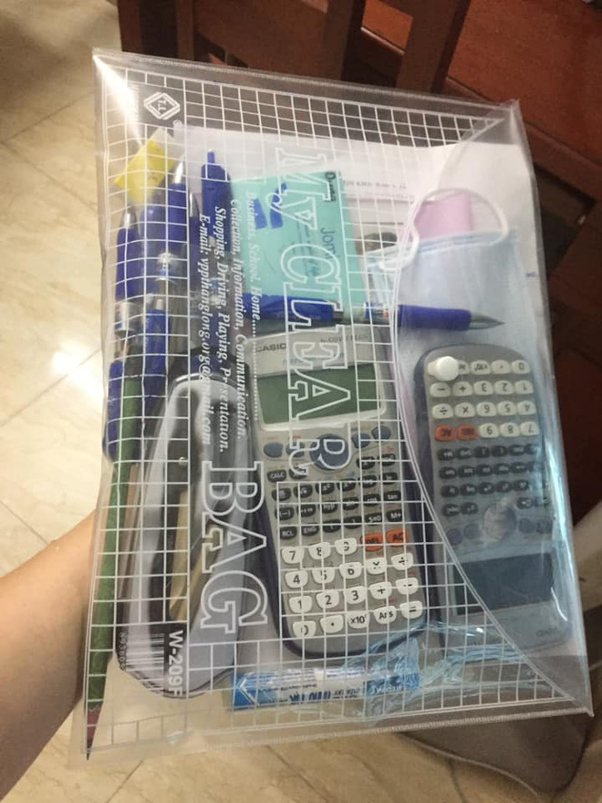 Nhưng khổ nỗi thí sinh cũng phải cầm theo rất nhiều đồ dùng vào. Thế là 1 nam sinh đã có pha xử lý hài hước, cho hết dụng cụ học tập vào... túi nylon.