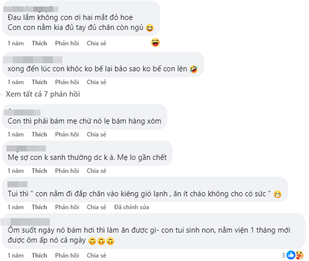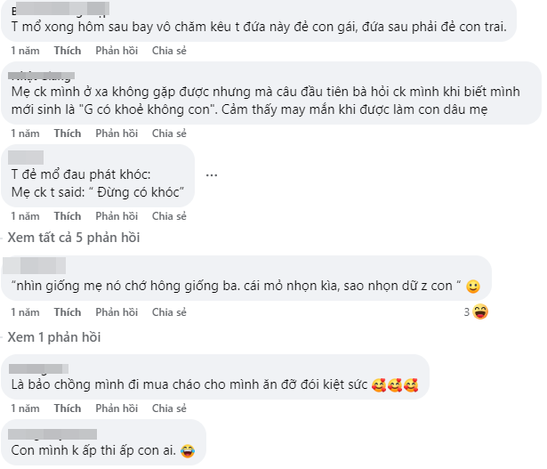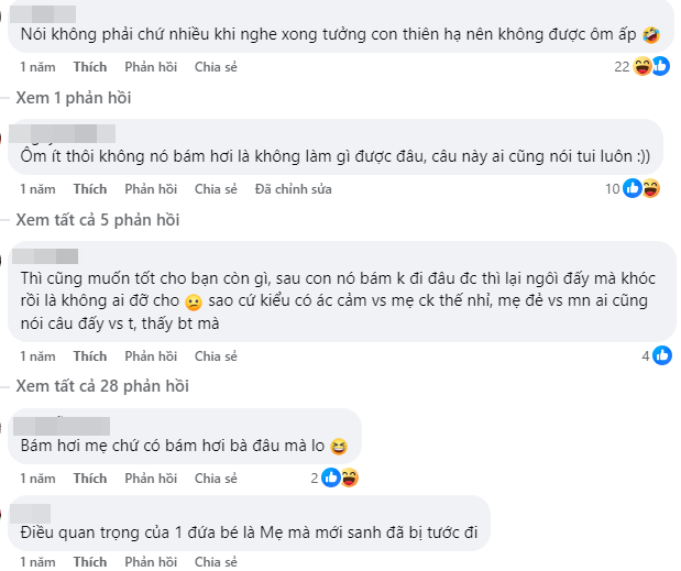 "Câu nói đầu tiên mẹ chồng nói với các mom khi từ phòng sinh ra là gì ạ? Em trước: Trời ơi sao cho con nằm gần vậy, nằm gần nó bám hơi thì sao, bỏ con xa ra", mẹ bỉm tâm sự.