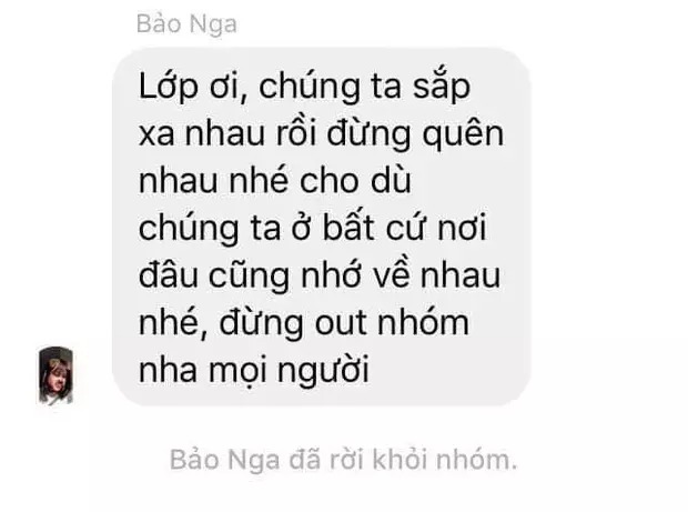 Như câu chuyện hài hước của cô nữ sinh Bảo Nga dưới đây là ví dụ. Cô nàng đã nhắn dòng tin nhắn xúc động vào group chat lớp: "Lớp ơi, chúng ta sắp xa nhau rồi đừng quên nhau nhé. Cho dù chúng ta ở bất cứ nơi đâu cũng nhớ về nhau nhé, đừng out nhóm nha mọi người".