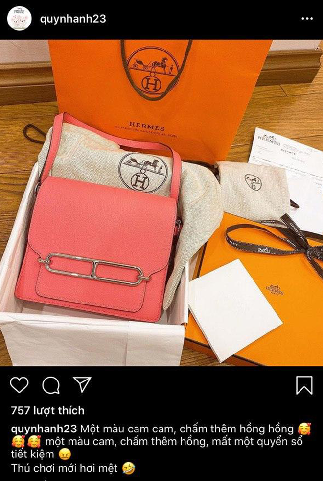 Để có được những con số ấy, Quỳnh Anh chia sẻ rằng cô đã "làm nhiều đến mức không có thời gian để mà nói". Chính vì làm việc chăm chỉ nên cô nàng đã tự thưởng cho mình khá nhiều quà, cả một núi hàng hiệu khiến fan hâm mộ xuýt xoa. Trước đó 1 tuần, Quỳnh Anh đã tậu 1 chiếc túi Hermes có giá bằng cả cuốn sổ tiết kiệm, hôm nay bà bầu 9X lại còn "mạnh tay" hơn sắm gấp chục lần, đúng là công chúa có khác!