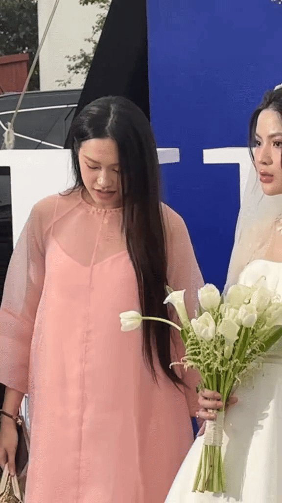 Ngoài ra, trong một video ghi lại, "mẹ bầu" Hải My còn rất nhiệt tình đứng tung hoa cho cô dâu Chu Thanh Huyền tiến vào sân khấu.