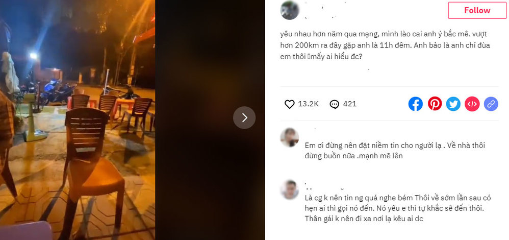 Trong bài đăng còn có hình ảnh của V. ngồi ở một quán nước với vẻ mặt khá buồn bã. Bài đăng của cô nhận được sự chia sẻ của cộng đồng mạng nhưng nhiều ý kiến cũng cho rằng, cô gái đã quá đặt niềm tin vào mối tình qua mạng trong khi theo đúng lẽ thường, người con trai kia phải là người chủ động trước.