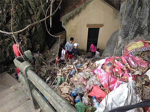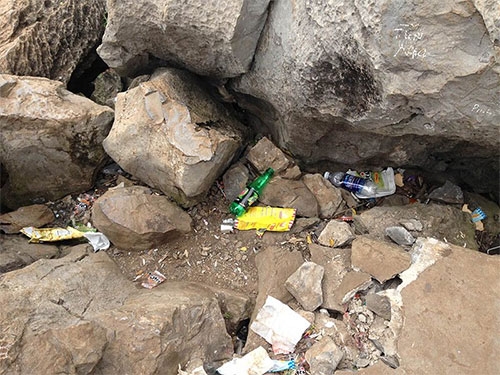 Trên đỉnh núi có rất nhiều rác, chủ yếu là chai nhựa và túi nilon gói đồ ăn |