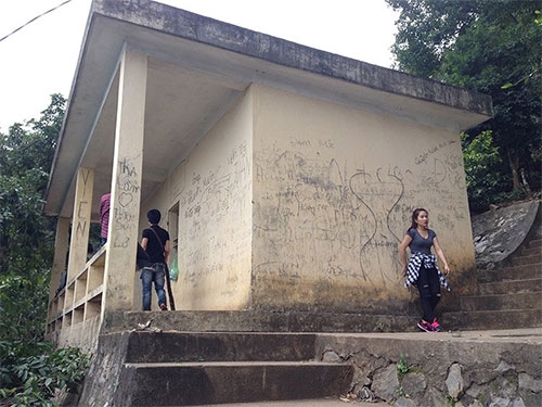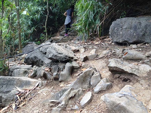 Gần 300m đường lên núi, có rất nhiều đoạn bậc thang đã hư hỏng, có nơi chỉ còn đá nhọn lởm chởm, người đi phải trèo qua từng phiến đá để lên. Các nhà vệ sinh cùng trạm dừng chân đã không còn được sử dụng.