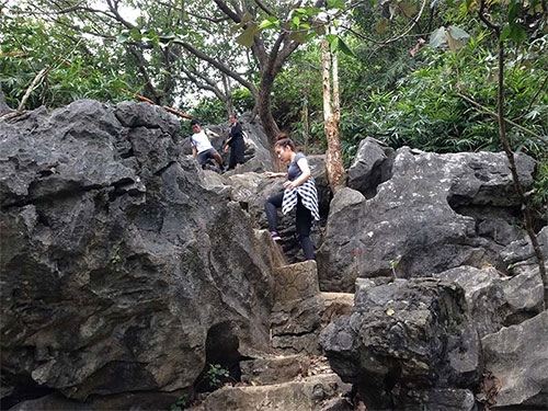 Trong vai khách khám phá "nóc nhà Hạ Long" - tôi trả phí 10.000 đồng để được đi qua ngõ nhỏ gần 1m của các hộ dân, rồi qua một đường bậc thang người dân tự xây nối sau một ngôi miếu lên tới đường chính trước đây của núi Bài Thơ.
