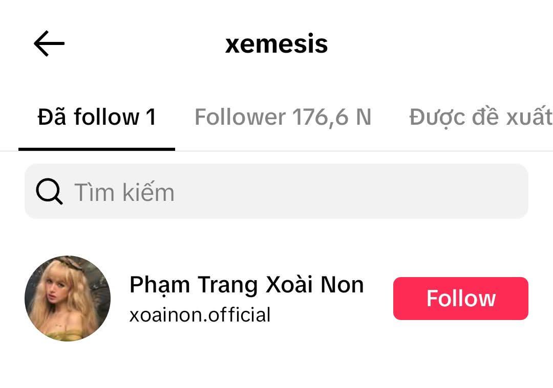Mới đây, MXH lan truyền thông tin nam streamer Xemesis (tên thật là Nghiêm Anh Hiếu) chỉ follow (theo dõi) duy nhất vợ cũ là Xoài Non (tên thật là Phạm Trang). Theo đó, tài khoản chính thức trên nền tảng TikTok của Xemesis với hơn 176k followers hiện chỉ theo dõi duy nhất một người là Xoài Non. Thông tin này được nhiều fanpage lớn đăng tải khiến cư dân mạng tò mò.
