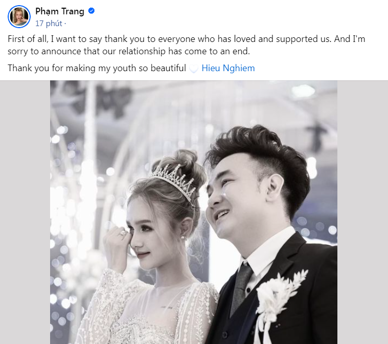 "Trước hết, tôi muốn gửi lời cảm ơn đến tất cả những người đã yêu mến và ủng hộ chúng tôi. Tôi rất tiếc phải thông báo rằng mối quan hệ của chúng tôi đã chính thức kết thúc."