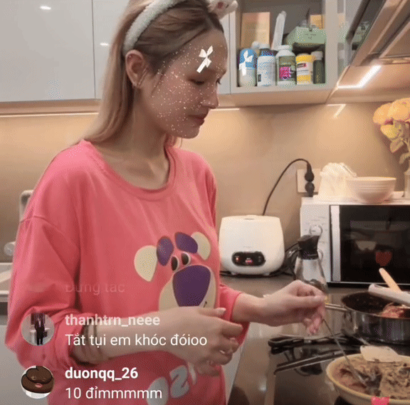 Trong khoảnh khắc này, hot girl 2k2 mặc đồ ở nhà đơn giản, vừa nấu ăn vừa hỏi chuyện Gil Lê: “Anh ăn gì từ sáng giờ chưa? Anh chưa đúng không?” . Thấy Gil trả lời “Anh đi tập từ sáng giờ” , Xoài Non không hài lòng nhưng vẫn lấy đồ ăn đang nấu tự tay đút cho người yêu, vừa để Gil thử vừa giúp đỡ đói. Thần sắc của cô nàng vui vẻ và tươi tắn, thái độ cũng dịu dàng trông thấy.