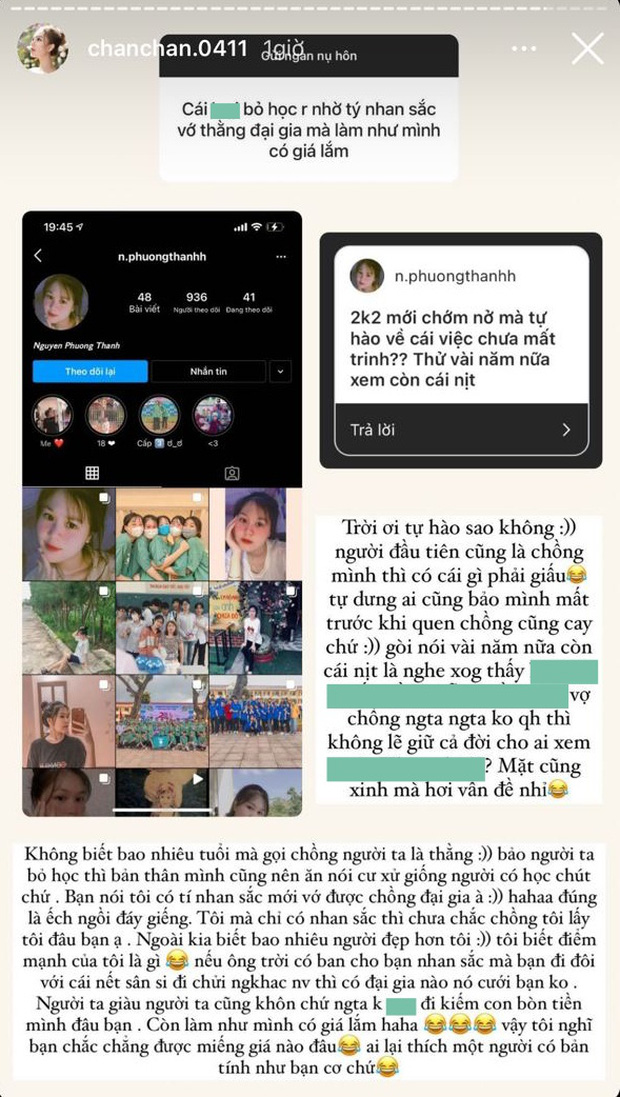 Mới đây nhất, Xoài Non lại thêm một lần nữa phải bật mode "khẩu chiến" với những antifan vào tận trang cá nhân, buông 1 tràng những lời nặng nề như "bỏ học, có tí nhan sắc vớ được đại gia mà làm giá" cho đến "2k2 còn nguyên có gì tự hào".