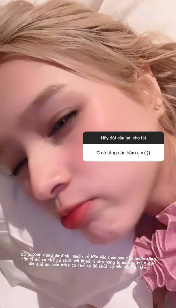 Theo đó, nàng dâu hào môn chia sẻ: "Xoài đang dự định muốn có bầu vào năm sau nên muốn tăng cân tí để cơ thể có chất với khoẻ mạnh để không bị mệt. Chứ Xoài đợt ốm quá mọi người bảo như thế không đủ chất, có bầu sẽ mệt lắm."