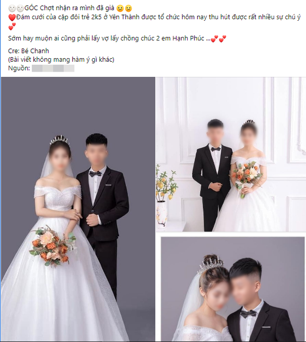 Kèm theo đó là dòng chia sẻ, "Đám cưới của cặp đôi trẻ 2005 ở Yên Thành được tổ chức hôm nay thu hút được rất nhiều sự chú ý. Sớm hay muộn ai cũng phải lấy vợ lấy chồng. Chúc 2 em hạnh phúc".