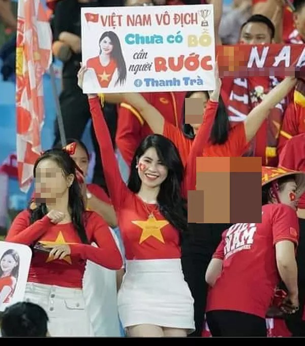 Mặc chiếc áo thun có hình cờ đỏ sao vàng, cô viết: "Việt Nam vô địch. Chưa có bồ, cần người rước, Thanh Trà".
