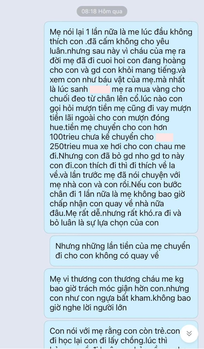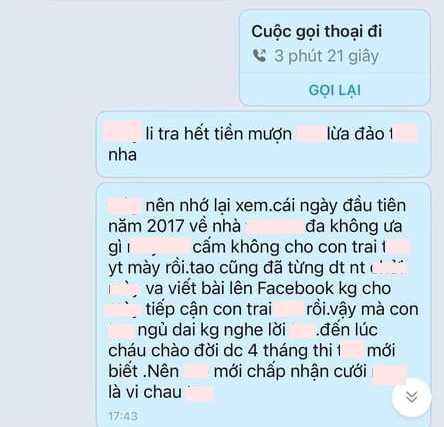 Trong loạt tin nhắn tung lên mạng, bà M. dùng nhiều lời lẽ nặng nề để nói con dâu. Bà M. cho biết con dâu mượn 250 triệu đồng, 1 cây vàng, mượn thêm 30 triệu đồng nhưng lần nào chuyển tiền cũng thấy tiền “quay về”. Bà M. cho rằng con dâu chỉ lợi dụng con trai mình, không có tình cảm vợ chồng gây tổn thương cho nhiều người.