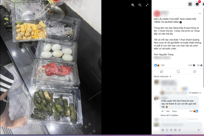 Theo đó, chị Nguyễn Trang chia sẻ, "một nhà hàng nổi tiếng tại Hạ Long bán nồi lẩu 665k được chỗ đồ này để nhúng. Mình không hiểu giờ đậu, chả lá lốt, 1 lạng thịt bò, trứng vịt lộn 6 quả. Như này là đắt hay rẻ hả mọi người?".