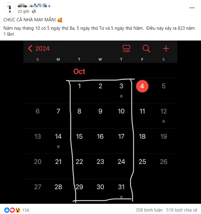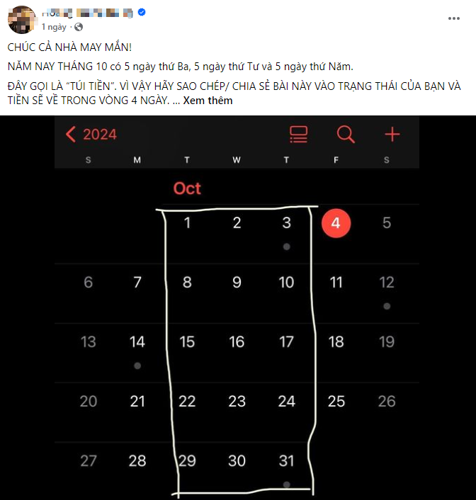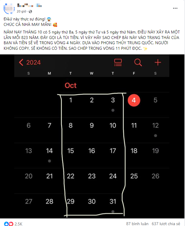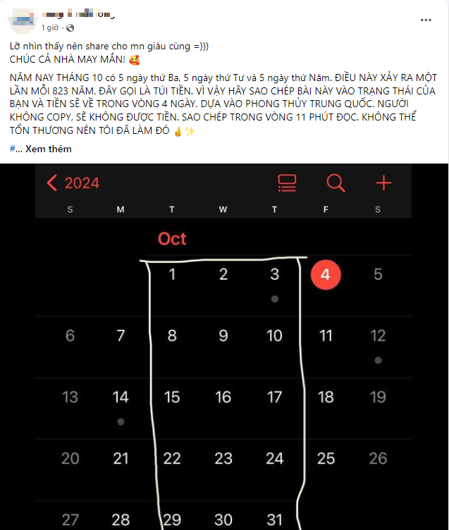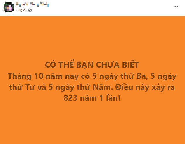 "Năm nay tháng 10 có 5 ngày thứ Ba, 5 ngày thứ Tư và 5 ngày thứ Năm. Điều này xảy ra một lần mỗi 823 năm. Theo phong thủy Trung Quốc, đây gọi là túi tiền. Vì vậy, hãy sao chép bài này vào trạng thái của bạn và tiền sẽ về trong vòng 4 ngày. Người không copy, sẽ không có tiền, sao chép trong vòng 11 phút đọc".