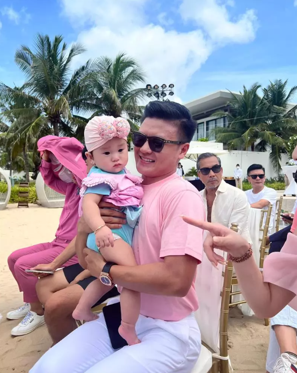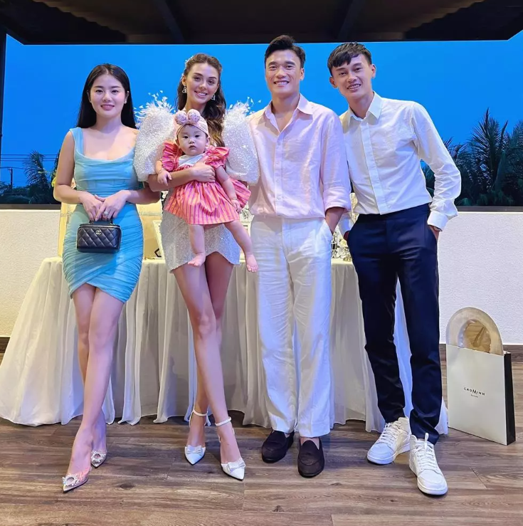 Trong ảnh Dũng "Gôn" và vợ mẫu Tây thay nhau bồng bế, check in cùng một bé gái xinh xắn, đáng yêu. Quang Hải cũng rất thích thú, chơi đùa với nhóc tỳ này.