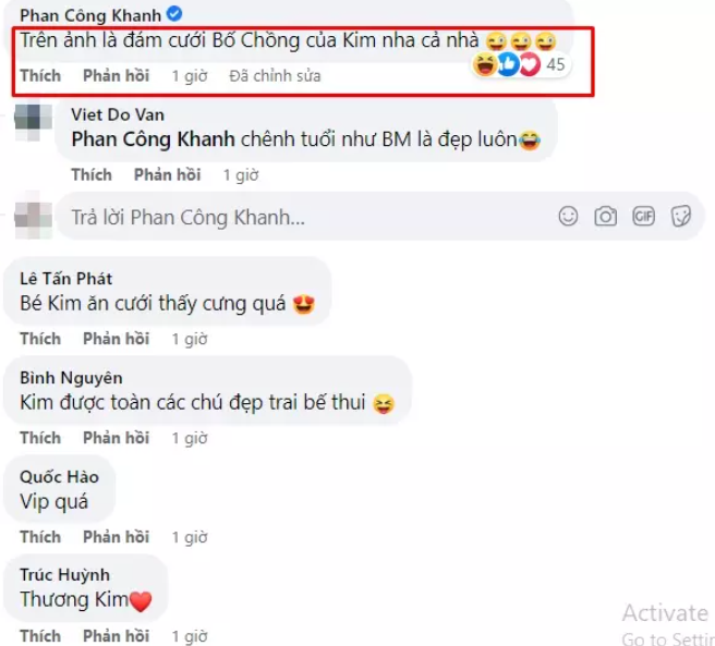 Gây chú ý đặc biệt dưới loạt ảnh cô bé và vợ chồng Dũng "Gôn" là bình luận của Phan Công Khanh. Theo đó, anh công khai cặp đôi chính là bố mẹ chồng của con gái mình.