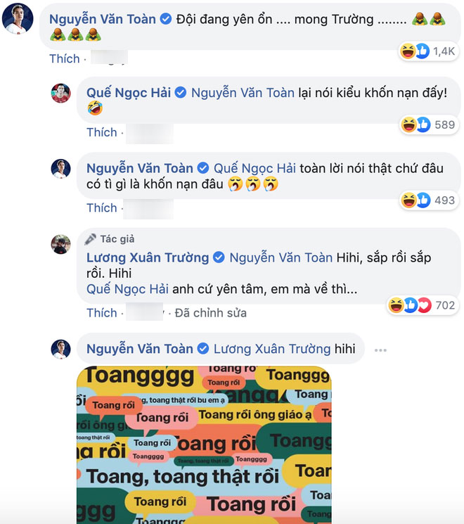 Tối 3/3, Văn Toàn vừa gây chú ý khi chia sẻ đoạn clip anh chàng cùng Văn Thanh gửi lời hỏi thăm sức khỏe người đồng đội thân thiết trên trang cá nhân. Điều đáng nói, thay vì gửi lời chúc một cách "tử tế" đến Xuân Trường, hai cậu em nghịch ngợm lại mỗi người một câu thay nhau "cà khịa" anh chàng: "Hello Xuân Trường. Anh dạo này khoẻ không? Đã cách ly đủ 14 ngày chưa? Bị lôi lên phường chưa? Chúc anh mau nhanh khỏi để trở lại HAGL. Đội đang yên ổn đừng về. HAGL không nhớ anh".