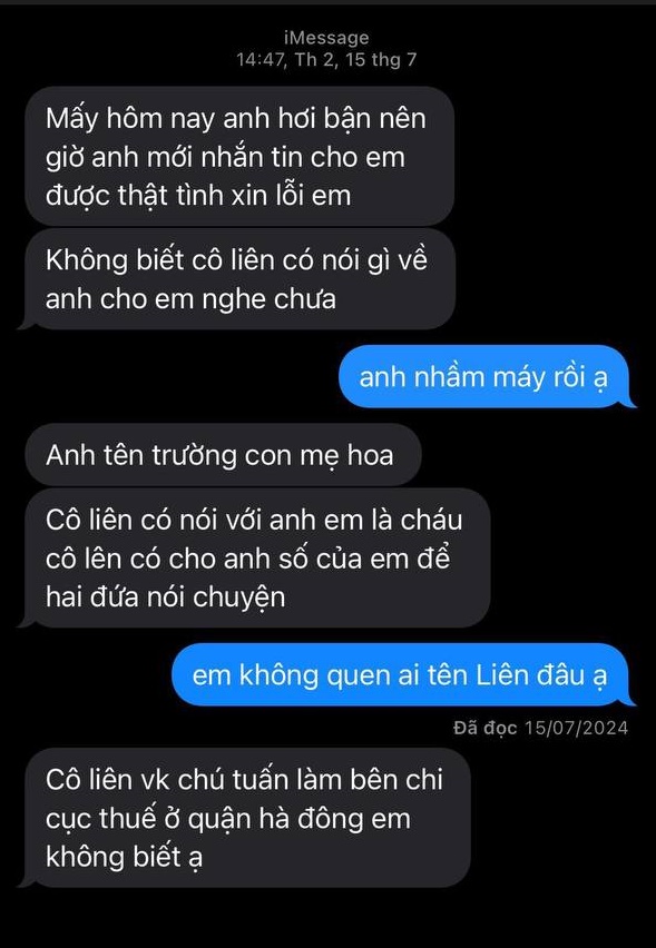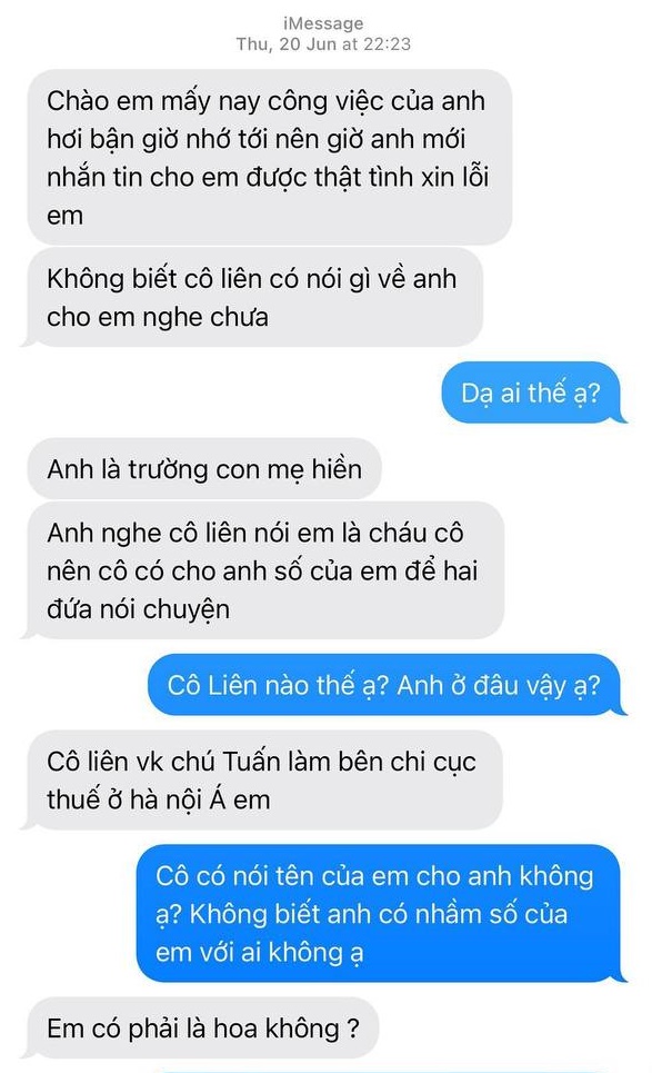 L.N chia sẻ: “Mình từng nhận tin nhắn nhưng không hiện số điện thoại mà hiện địa chỉ icloud của người đó. Mình cũng nhắn qua lại một hồi xem họ muốn gì. Nhưng thấy văn vẻ làm quen sến súa quá nên mới không nhắn nữa. Hoá ra đây là chiêu thức lừa đảo mà mình không biết. Nếu không cảnh giác nhắn thêm có khi cũng bị dẫn dụ gì rồi”.