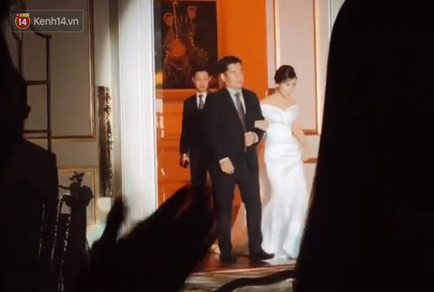 Trong giờ phút thiêng liêng, mọi sự chú ý đổ dồn về phía cánh cửa trắng. Cô dâu Viên Minh cùng người cha thân yêu bước vào hội trường. Nàng WAG diện trên mình chiếc váy màu trắng tinh khôi với thiết kế trễ vai giúp khoe bờ vai trần mảnh mai. Viên Minh chắc chắn là người xinh đẹp và hạnh phúc nhất buổi tối hôm nay. Cô nàng bước đi bên cha đầy tự tin, gương mặt luôn nở nụ cười rạng rỡ. Sau đó là khoảnh khắc mọi người cùng nâng ly chúc mừng hạnh phúc đôi bạn trẻ.
