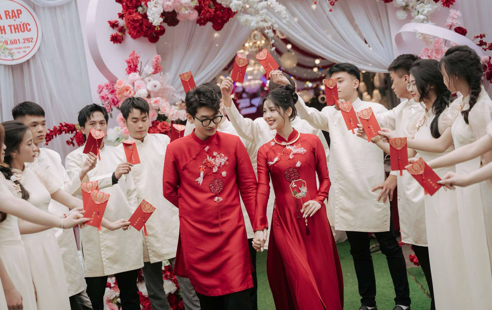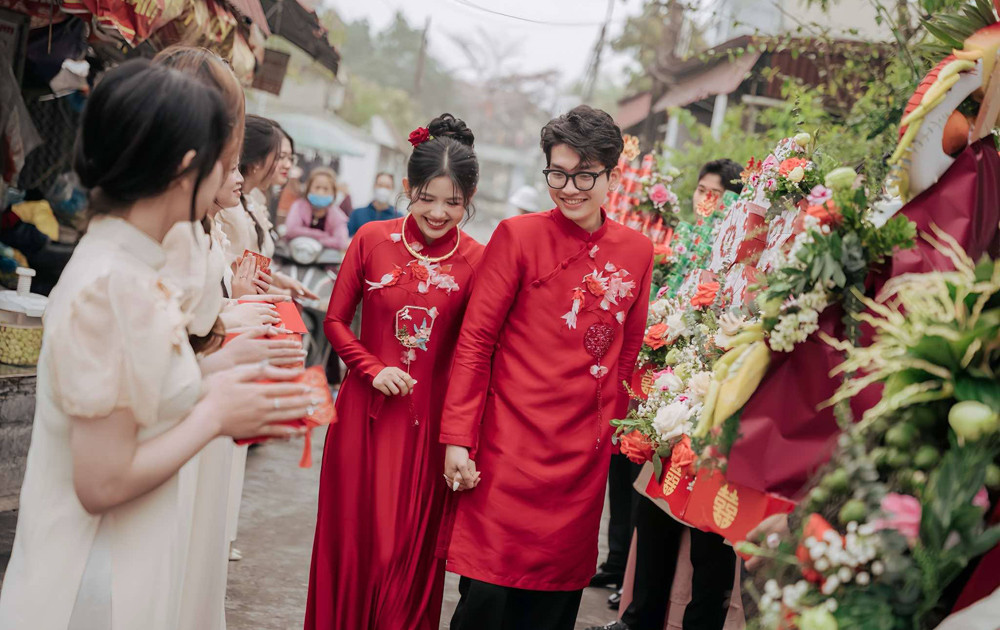 Cặp đôi đỡ chung một tráp lễ. Ấn tượng của Hinh về Thư là “cô gái xinh đẹp, có gương mặt thân quen”. Sau đó, anh mới nhận ra cô là bạn bè trên Facebook.