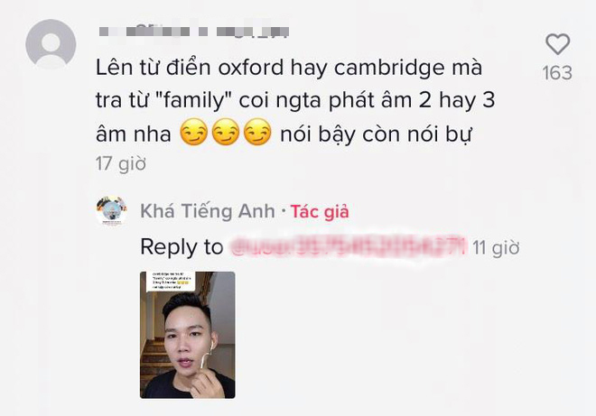 Theo đó, video một cô giáo dạy tiếng Anh nói rằng family là từ có 3 âm tiết nhưng cách phát âm phổ biến là 2, Tuy vậy, anh chàng thầy giáo vẫn bị hứng rổ gạch vì không chịu nhận mình đã mắc lỗi sai trước đó, nhất nhất khẳng định cách đọc 3 âm tiết với family là sai.