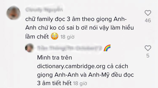 Ngay lập tức, dân mạng phản pháo rằng với từ family, cách đọc đúng vẫn phải là 3 âm tiết. Theo đó nhiều người đồng tình với quan điểm, khi phát âm tiếng Anh - Mỹ, vì cách đọc lướt hay rút gọn mà từ family từ 3 âm tiết thành 2 âm tiết.