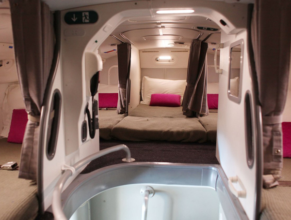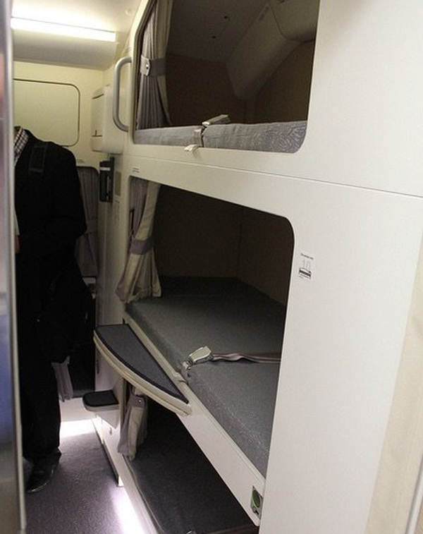 Phi công có thể trèo lên chỗ ngủ thông qua những bậc thang nhỏ được thiết kế kín đáo, tránh xa tầm quan sát của hành khách. Giường của phi công khá rộng rãi và được bố trí hệ thống cách âm, nhằm đảm bảo sự yên tĩnh.