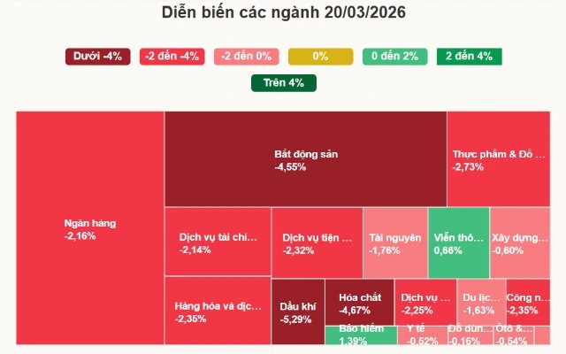 Phiên giao dịch 20/3 chứng kiến áp lực điều chỉnh lan rộng trên toàn thị trường khi nhiều cổ phiếu vốn hóa lớn giảm mạnh, thậm chí một số mã rơi xuống mức sàn, kéo VN-Index xuống dưới mốc 1.650 điểm.
