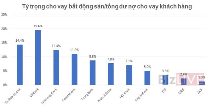 Chi tiết cho từng ngân hàng, tỷ trọng dư nợ cho vay kinh doanh bất động sản so với tổng dư nợ cho vay khách hàng chiếm 2,4% đến 14,4%; nếu tính cả số dư cho vay cá nhân để mua nhà ở, nhận quyền sử dụng đất để xây nhà tỷ trọng trên có thể lên đến 20% hoặc nhỉnh hơn.