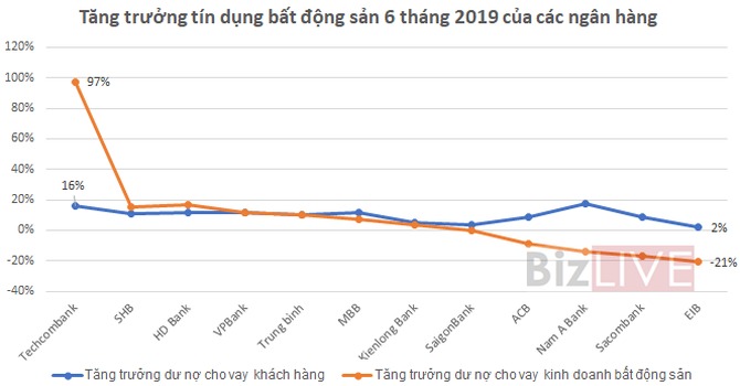 Tỷ trọng cho vay kinh doanh bất động sản/tổng dư nợ cho vay khách hàng của Techcombank tại ngày cuối tháng 6/2019 là 14,4% (số liệu này chưa bao gồm số dư cho khách hàng cá nhân vay để mua nhà ở, nhận quyền sử dụng đất để xây nhà). Techcombank cũng dẫn đầu nhóm các ngân hàng về tăng trưởng dư nợ cho vay kinh doanh bất động sản trong 6 tháng đầu năm, tăng đến 97% so với hồi đầu năm, đạt mức 26.723 tỷ đồng.