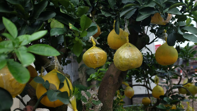 Ngoài bán lẻ từng quả, anh Huy cũng ghép bưởi thỏi vàng lên những chậu bưởi cảnh có tuổi đời trên 5 năm, mỗi cây ghép thêm 3-5 quả bưởi thỏi vàng và được rao bán với giá từ 10 - 15 triệu đồng/chậu.
