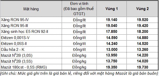 Sau khi trích lập, giá bán lẻ trong nước xăng E5 RON 92 không cao hơn 17.851 đồng/lít, xăng RON 95-III không cao hơn 19.046 đồng/lít, dầu diesel 0.05S không cao hơn 14.243 đồng/lít, dầu hỏa không cao hơn 13.004 đồng/lít và dầu mazut 180CST 3.5S không cao hơn 13.757 đồng/kg.